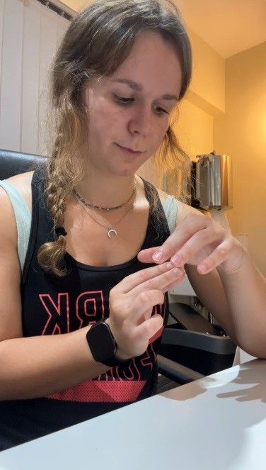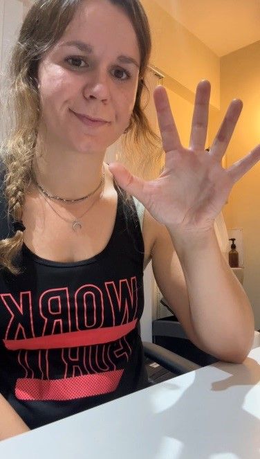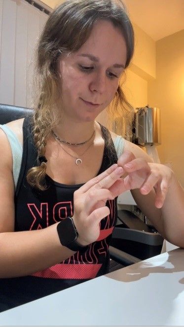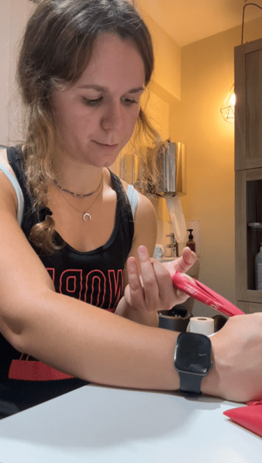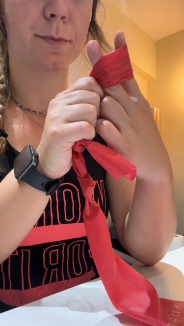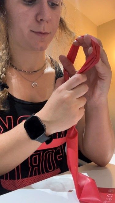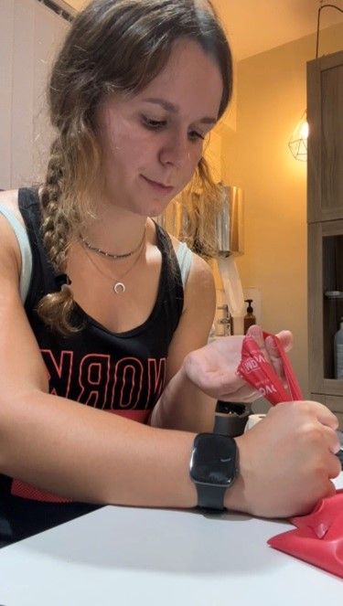 Coloca una goma elástica alrededor de todos los dedos y el pulgar. Abre lentamente la mano, separando los dedos. Puedes hacerlo con todos a la vez o solo separando dos dedos entre sí.