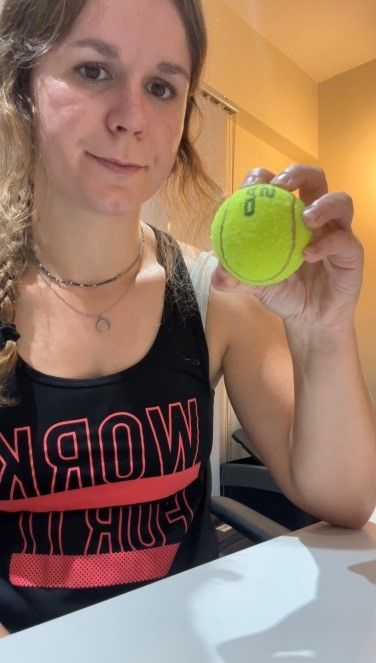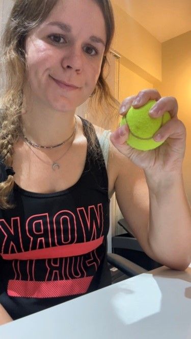 Usar una pelota blanda y después progresar a una más dura (como una pelota de tenis) para hacer agarres con fuerza de la misma, manteniendo 3–5 segundos la presión con el objetivo defortalecer los flexores sin sobrecargar el tendón. También puedes hacer el gesto de la pinza, tocando la punta del pulgar con cada dedo (índice, medio, anular, meñique), haciendo una ligera presión.