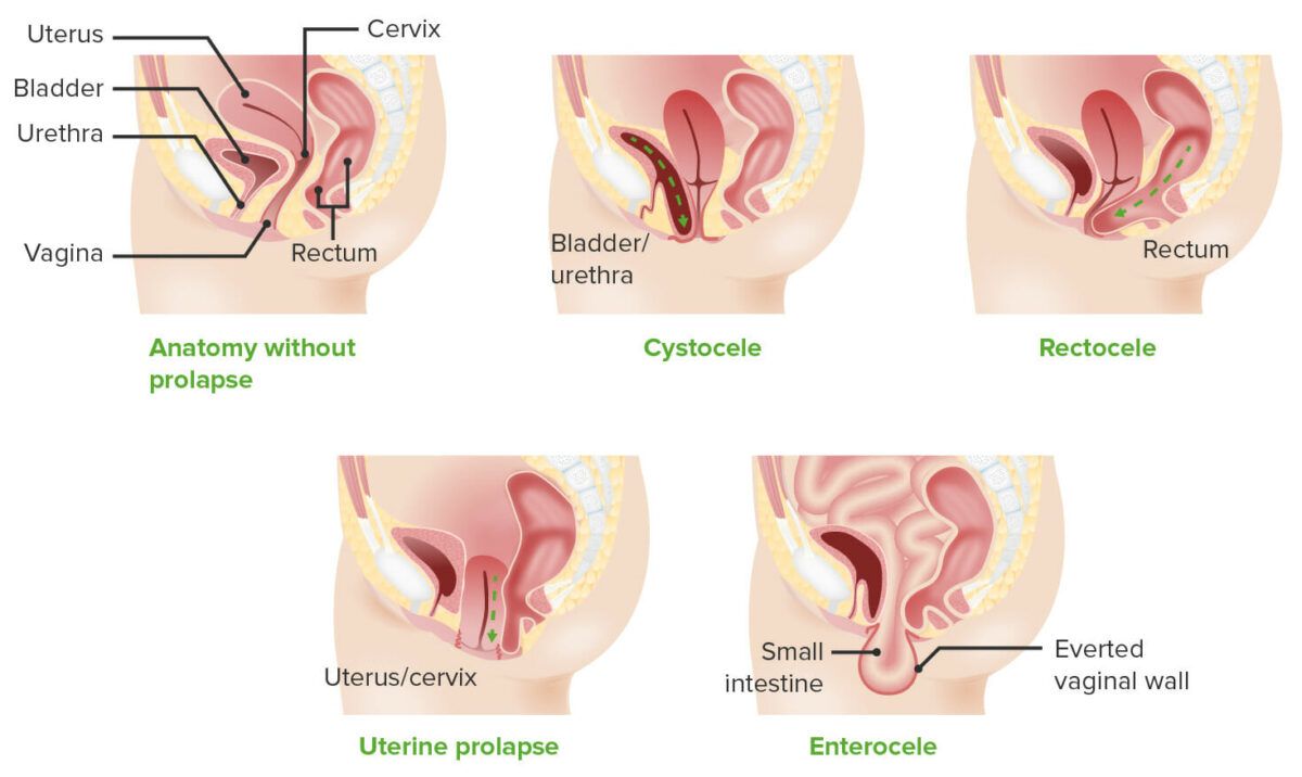 El prolapso se define como un descenso del sitio anatómicamente correcto de algún órgano (vejiga, útero, recto o intestino delgado) por debilidad de los tejidos que conforman el suelo pélvico (músculos, ligamentos y/o fascia). Por lo tanto, aparece cuando la función de soporte de órganos falla. Tienen diferentes nombres en función del órgano descendido y distintos grados según la magnitud del descenso.