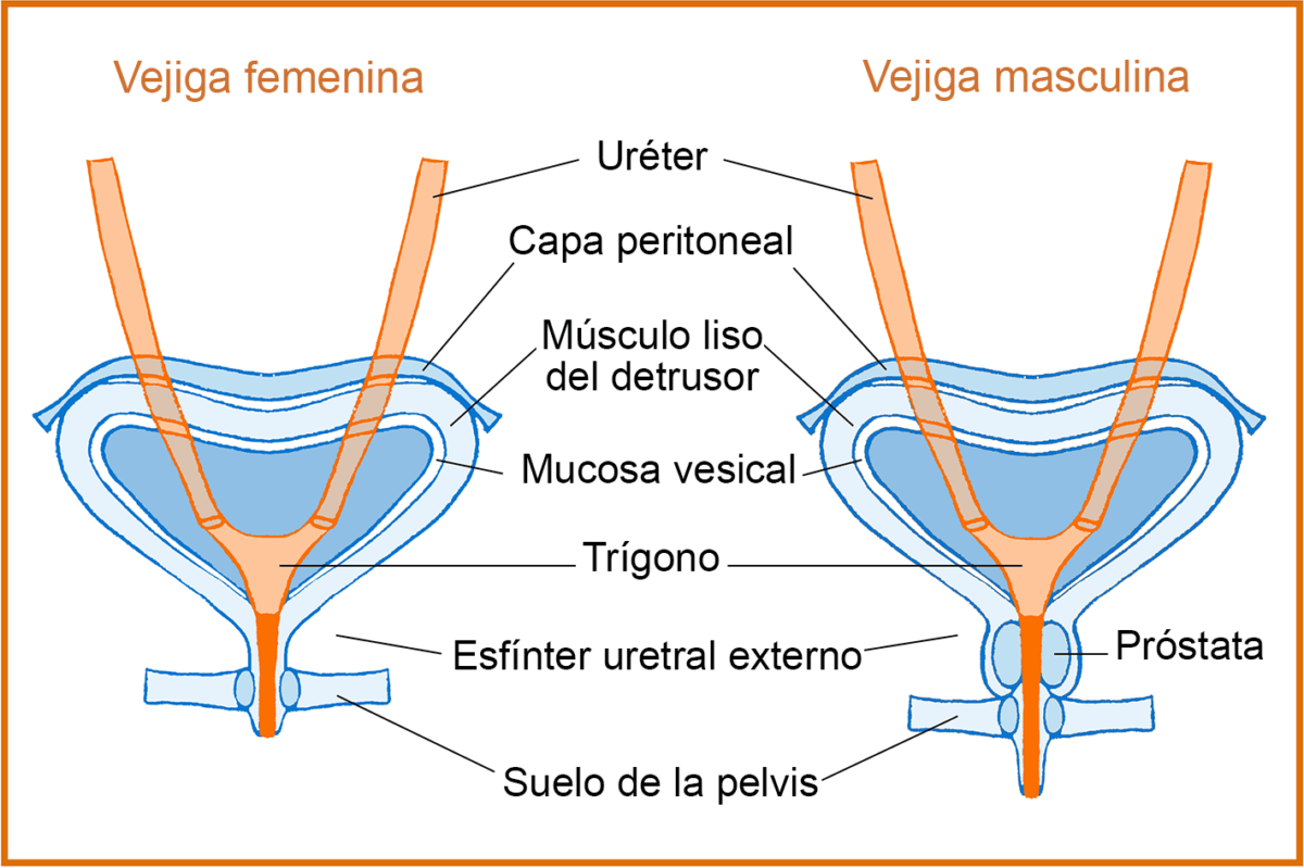 La vejiga es un órgano hueco y elástico que almacena la orina que llega desde los riñones. Está rodeada por capas musculares siendo la más importante el músculo detrusor, que es controlado por el sistema nervioso involuntario. Cuando el detrusor está relajado, permite que la vejiga se llene (fase de llenado), pero si se contrae, expulsa la orina (fase de vaciado).