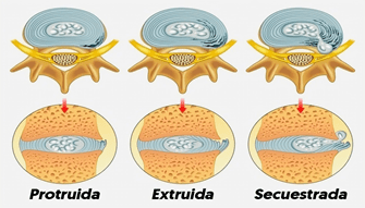 1. Protrusión discal: el núcleo se desplaza pero sigue contenido por el anillo fibroso. Es el hallazgo más común y, en la mayoría de casos, no genera síntomas.